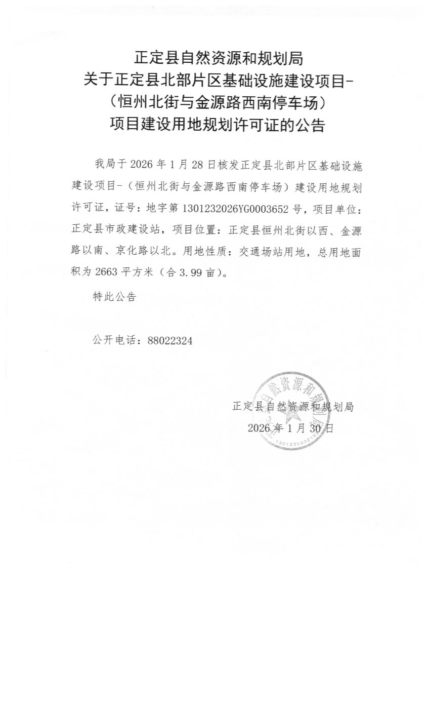 正定县自然资源和规划局关于正定县北部片区基础设施建设项目-(恒州北街与金源路西南停车场)项目建设用地规划许可证的公告