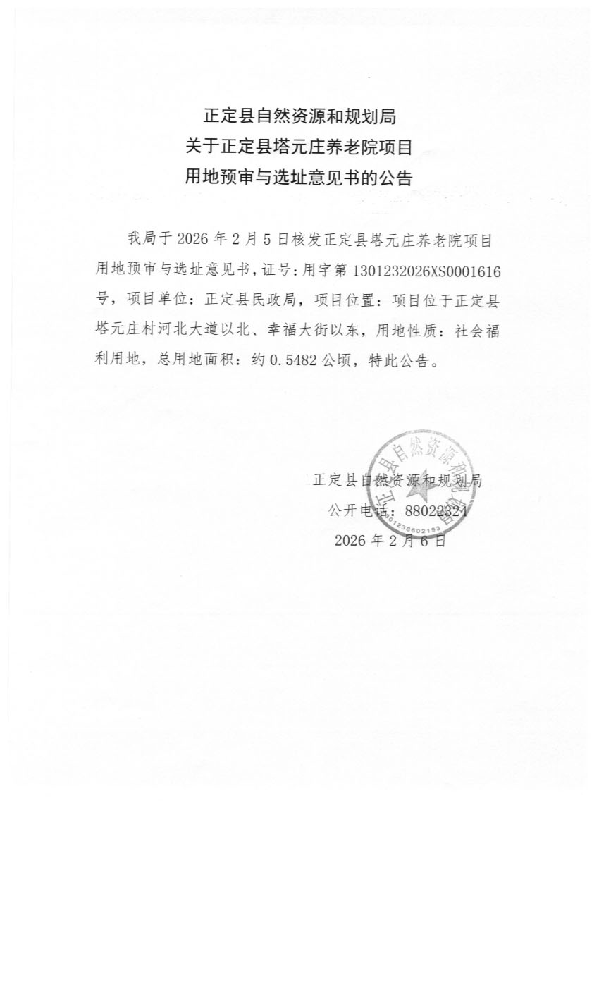 正定县自然资源和规划局关于正定县塔元庄养老院项目用地预审与选址意见书的公告