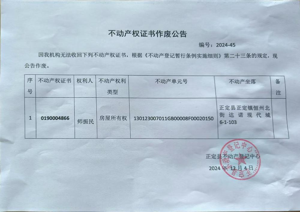 师振民不动产权证书作废公告