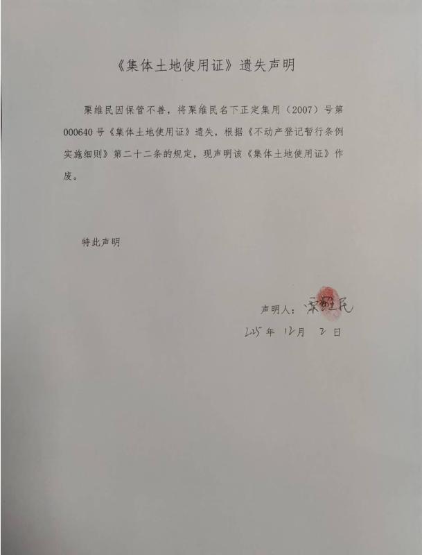栗维民《集体土地使用证》遗失声明