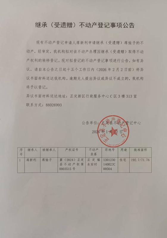 蒋新利继承(受遗赠)不动产登记事项公告