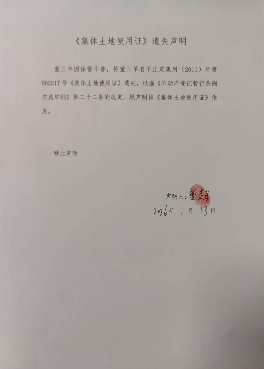 董三羊《集体土地使用证》遗失声明