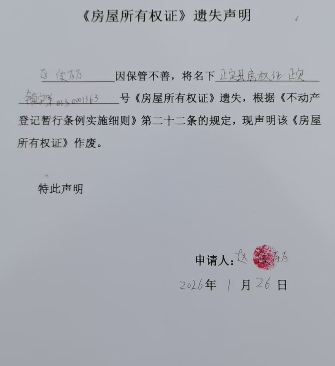 赵俊丽房屋所有权证遗失声明