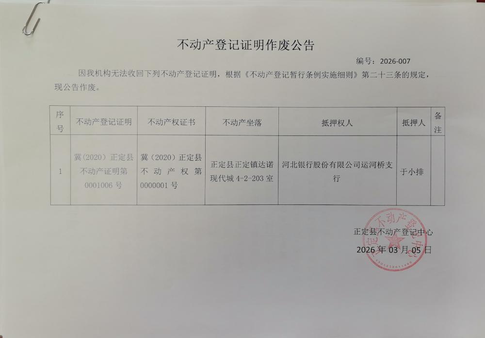 于小排不动产登记证明作废公告