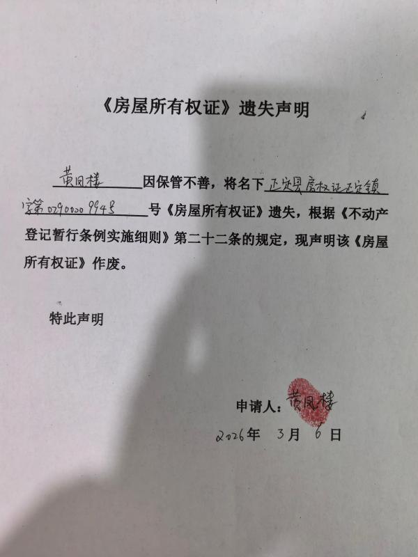 黄凤楼房屋所有权证遗失声明