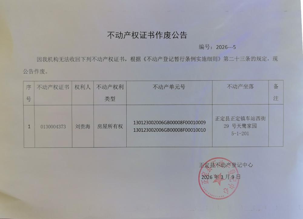 刘贵海不动产权证书作废公告