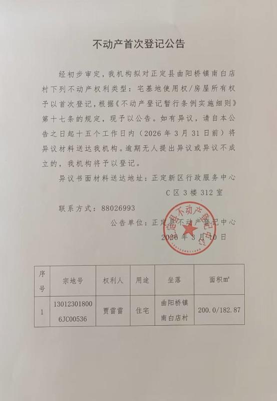 贾雷雷不动产首次登记公告
