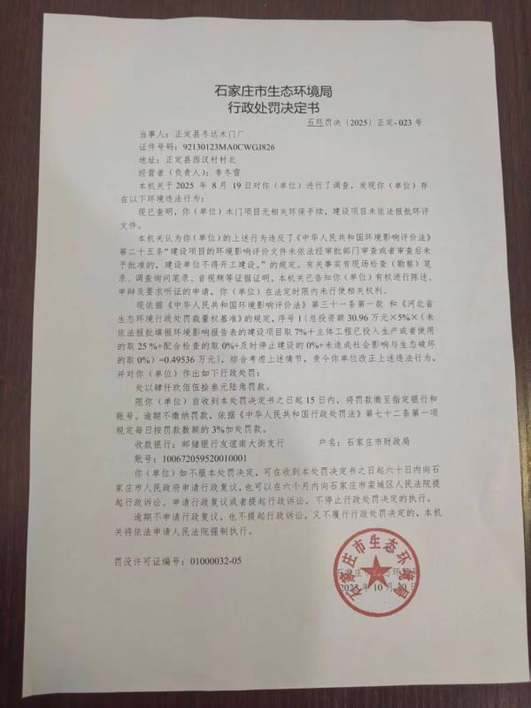 正定县冬达木门厂行政处罚决定书