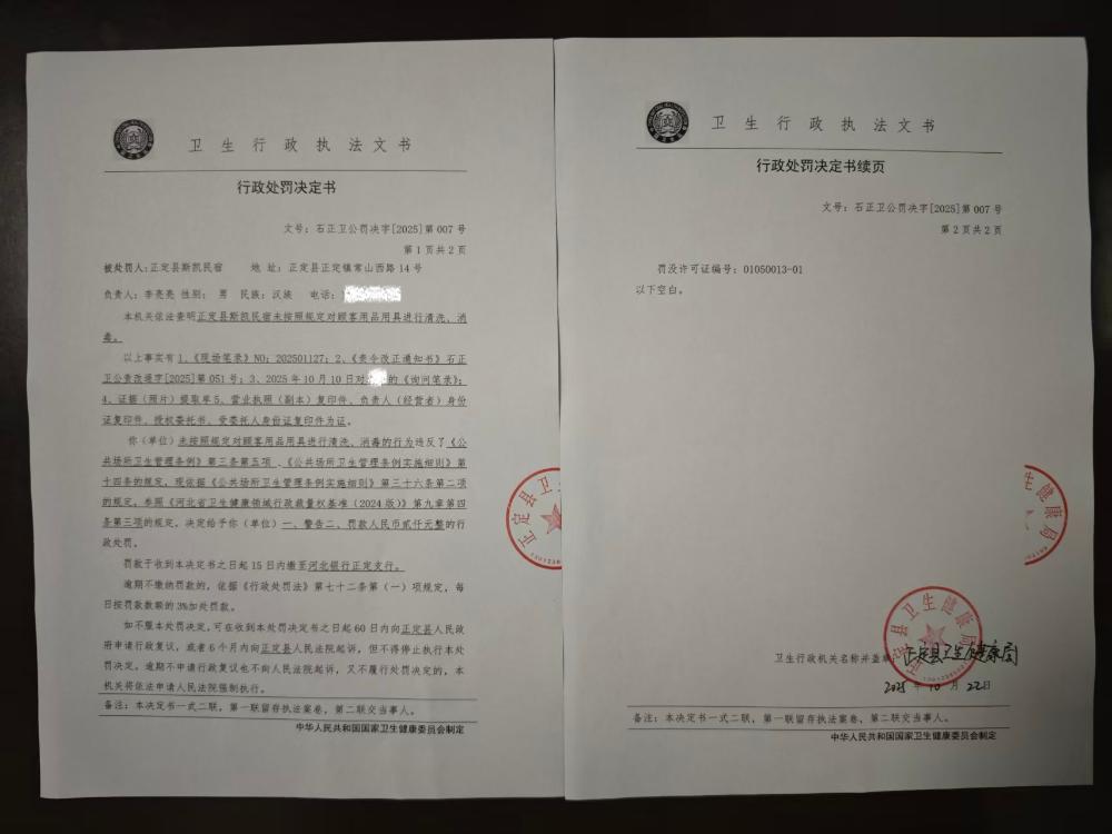 正定县斯凯民宿未按照规定对顾客用品用县进行清洗、消毒案