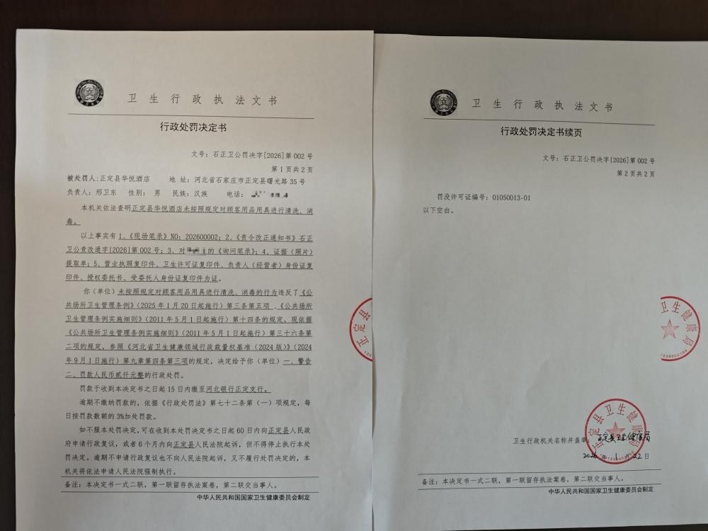 正定县华悦酒店未按照规定对顾客用品用具进行清洗、消毒案