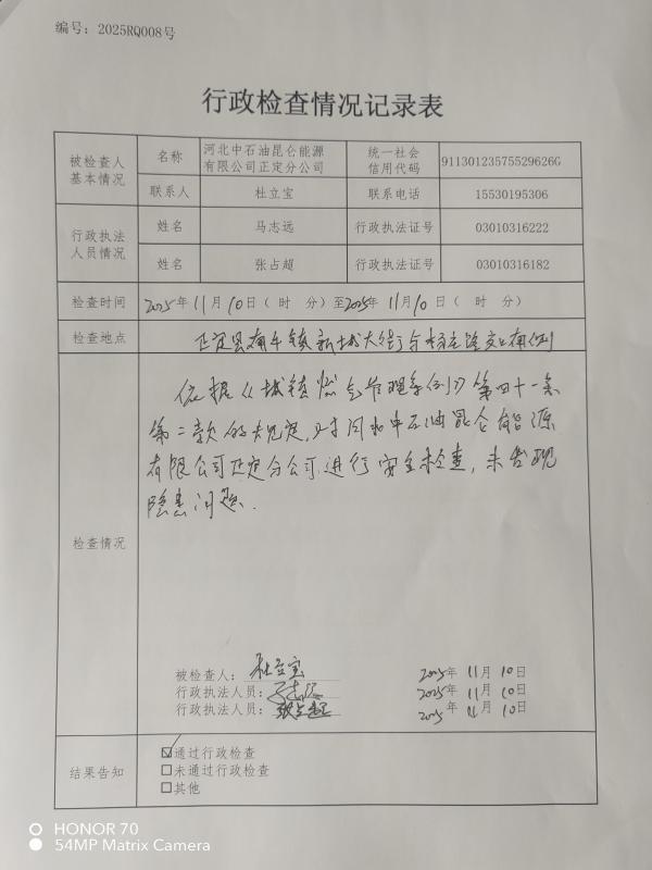 正定县城市管理综合行政执法局行政检查结果公示(河北中石油昆仑能源有限公司正定分公司)
