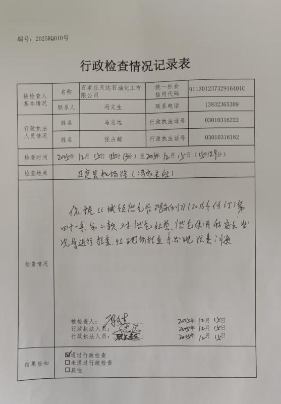 正定县城市管理综合行政执法局行政检查结果公示(石家庄天达石油化工有限公司)