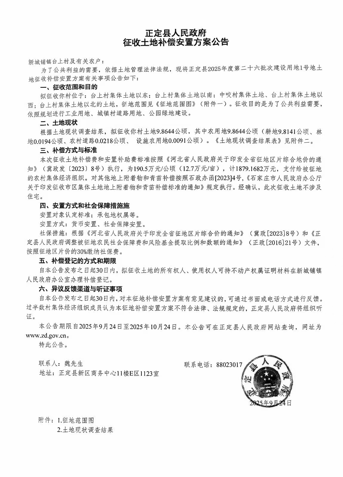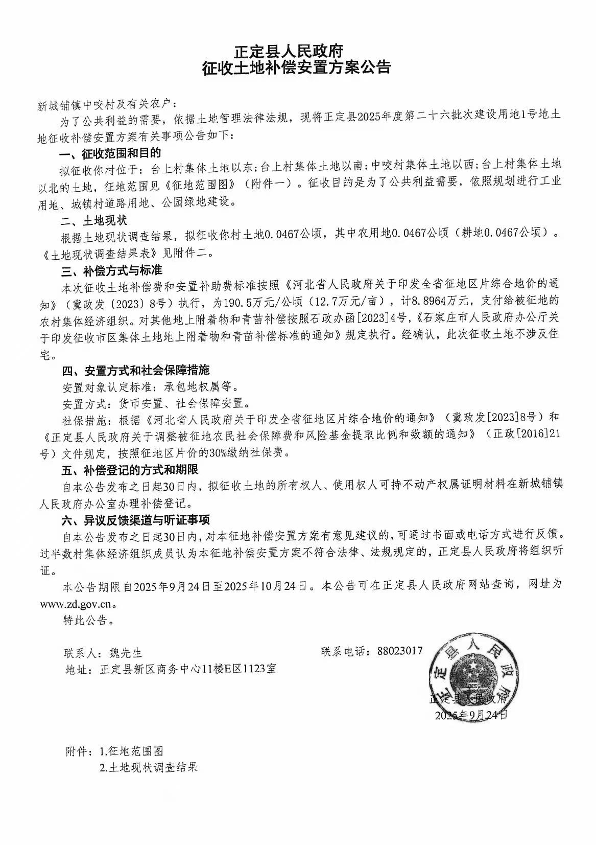 正定县人民政府关于正定县2025年度第二十六批次建设用地1号地征收土地补偿安置方案公告
