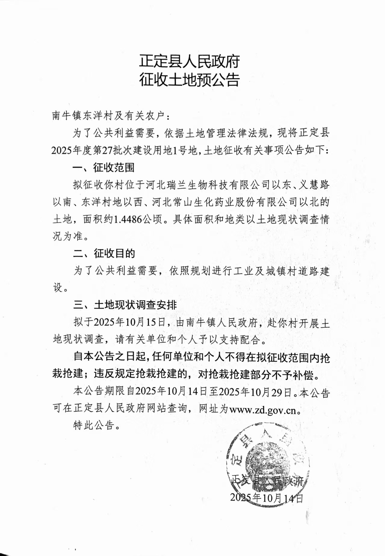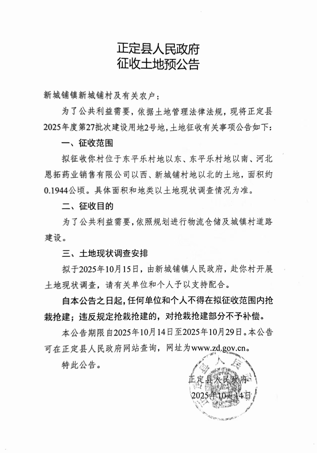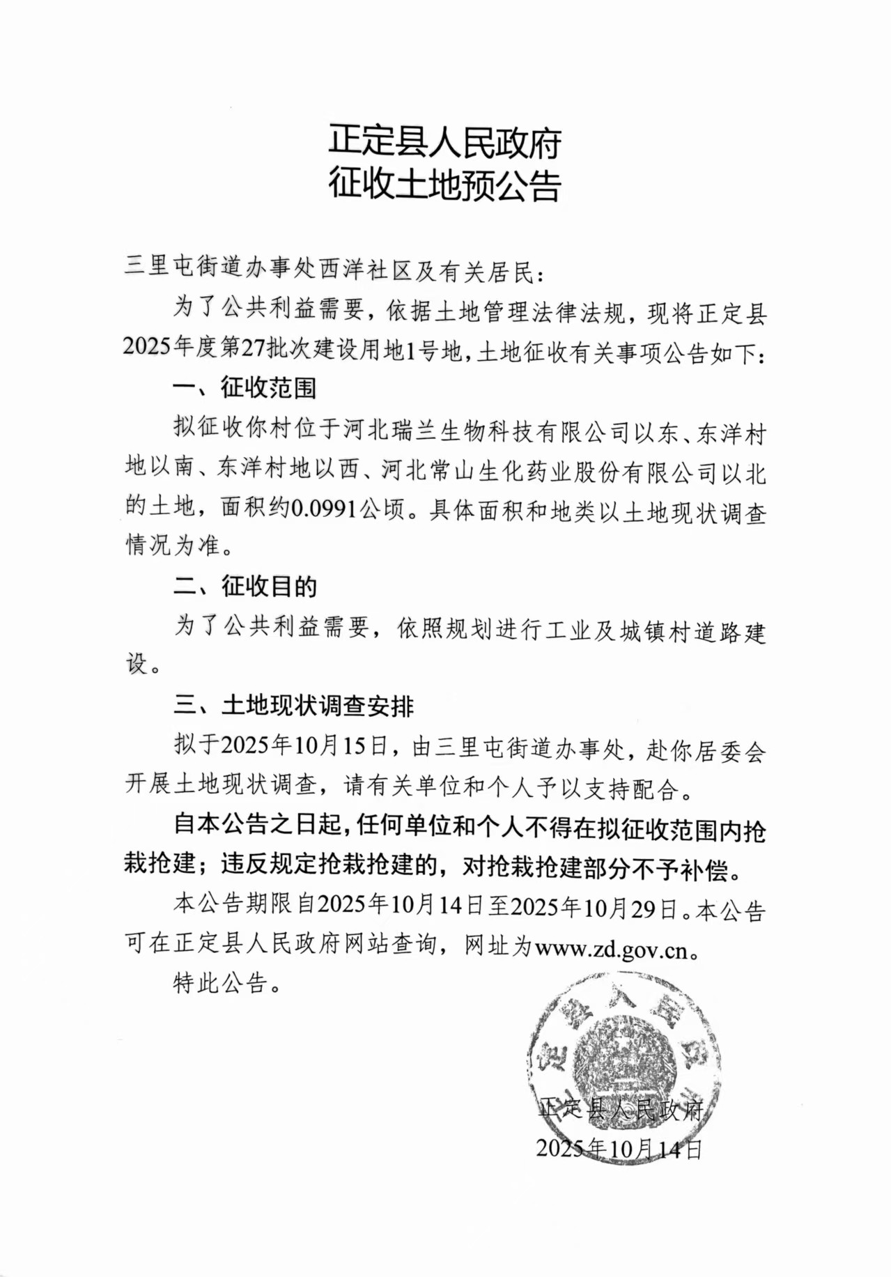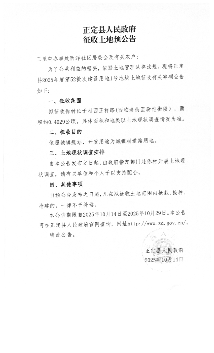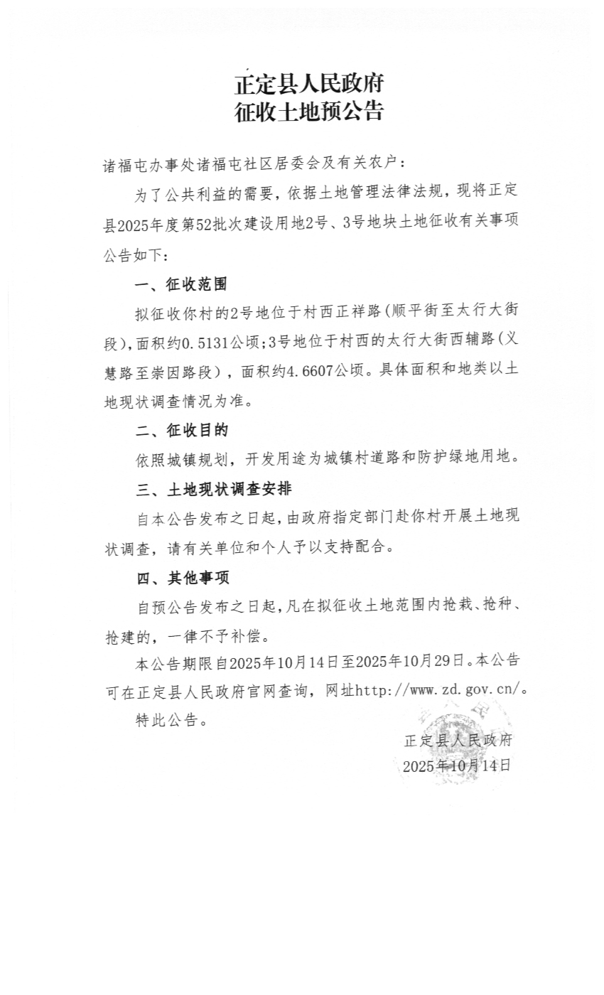 正定县人民政府关于正定县2025年度第27批次、52批次建设用地征收土地预公告