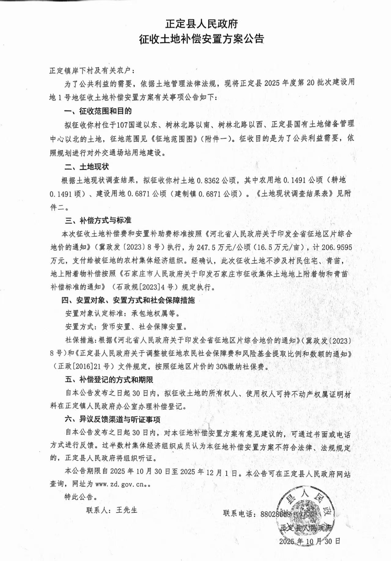 正定县人民政府关于正定县2025年度第20批次建设用地1号地征收土地补偿安置方案公告