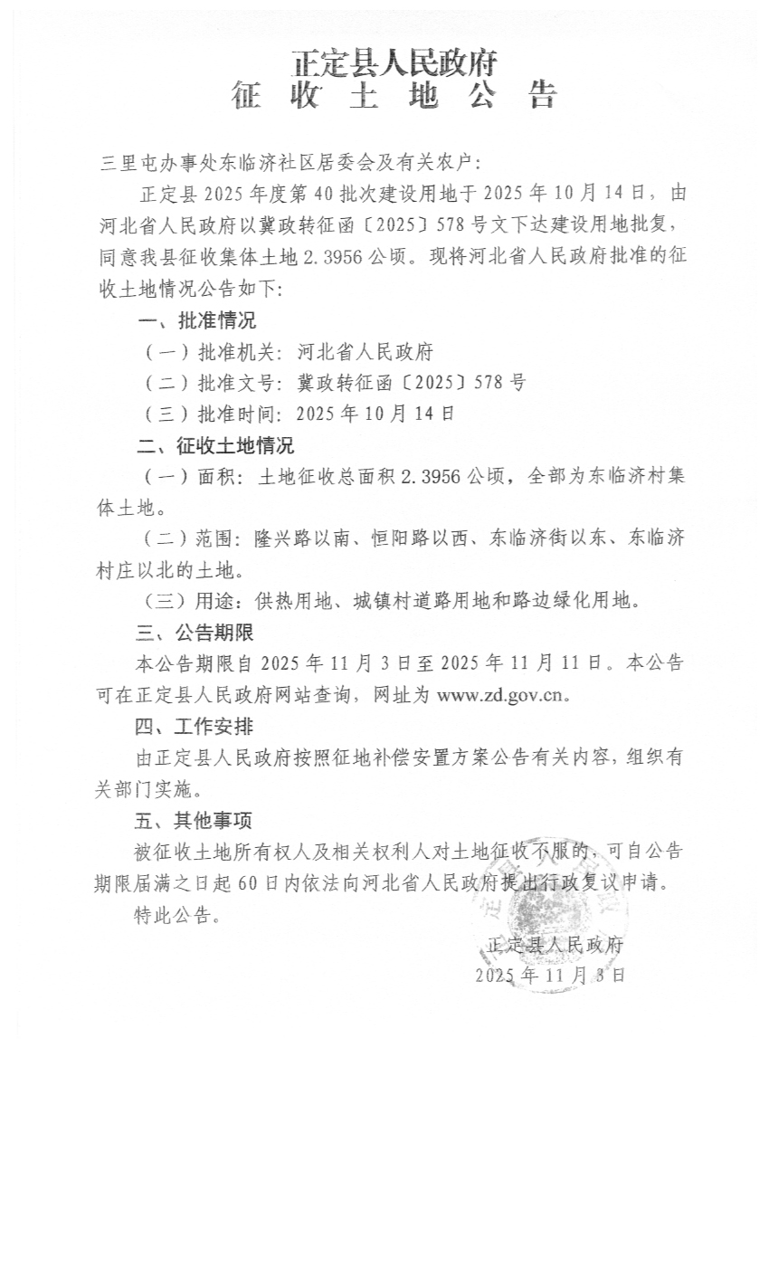正定县人民政府关于正定县2025年度第40批次建设用地征收土地公告