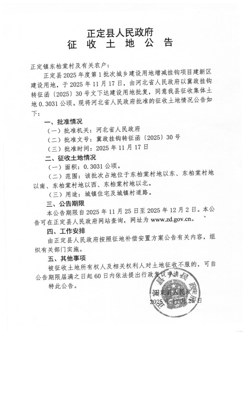 正定县人民政府关于正定县2025年度第1批次城乡建设用地增减挂钩项目建新区建设用地征收土地公告