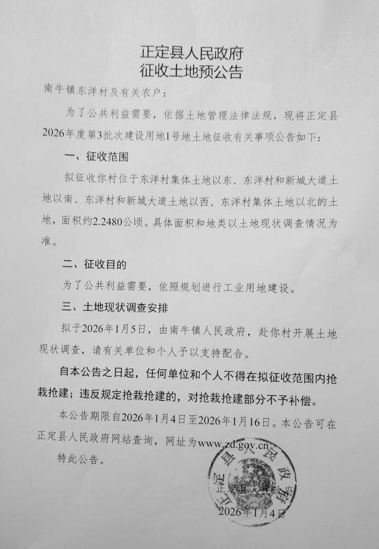 正定县人民政府关于正定县2026年度第3批次建设用地1号地征收土地预公告