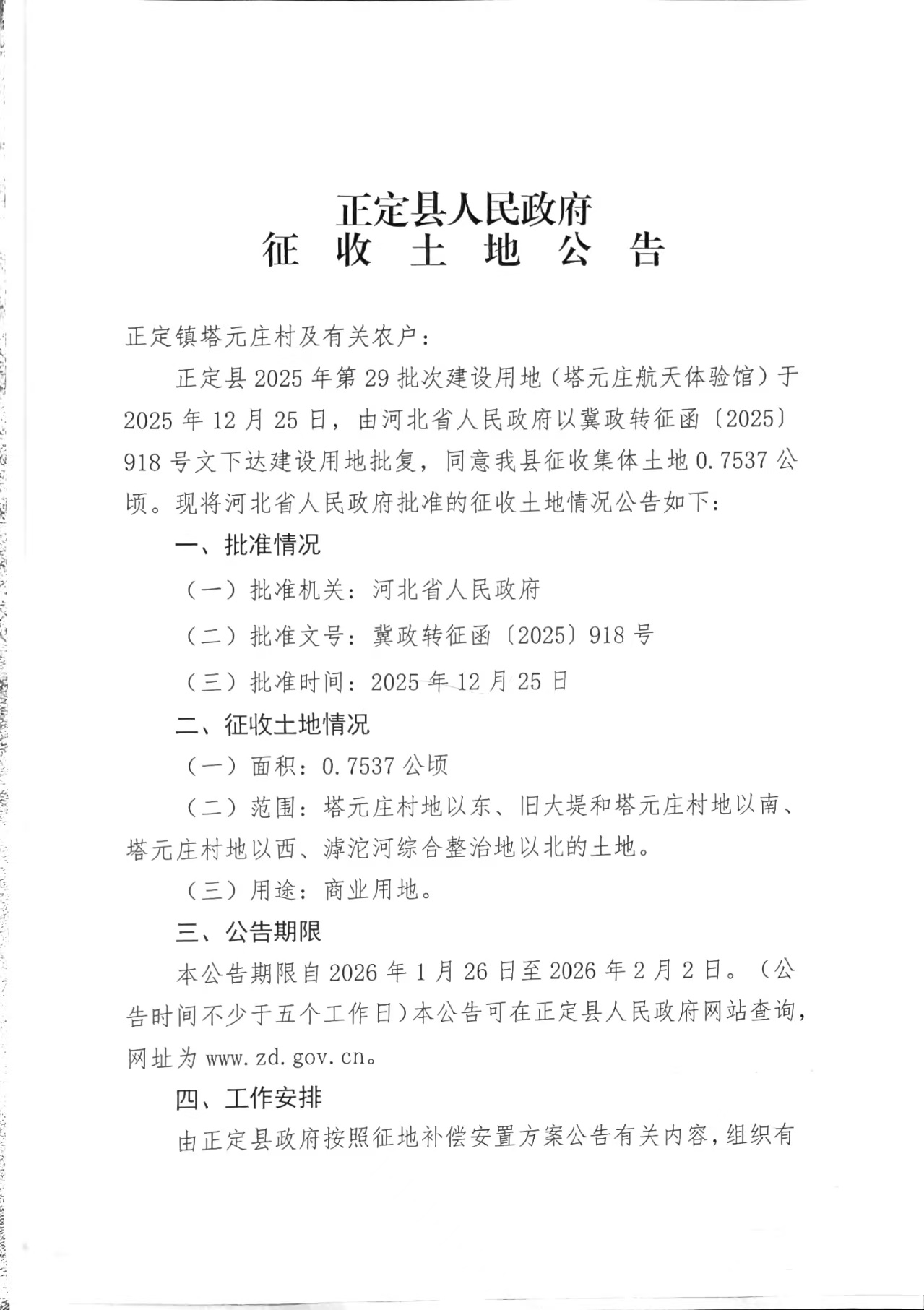 正定县人民政府关于正定县2025年度第29批次建设用地(塔元庄航天体验馆)征收土地公告