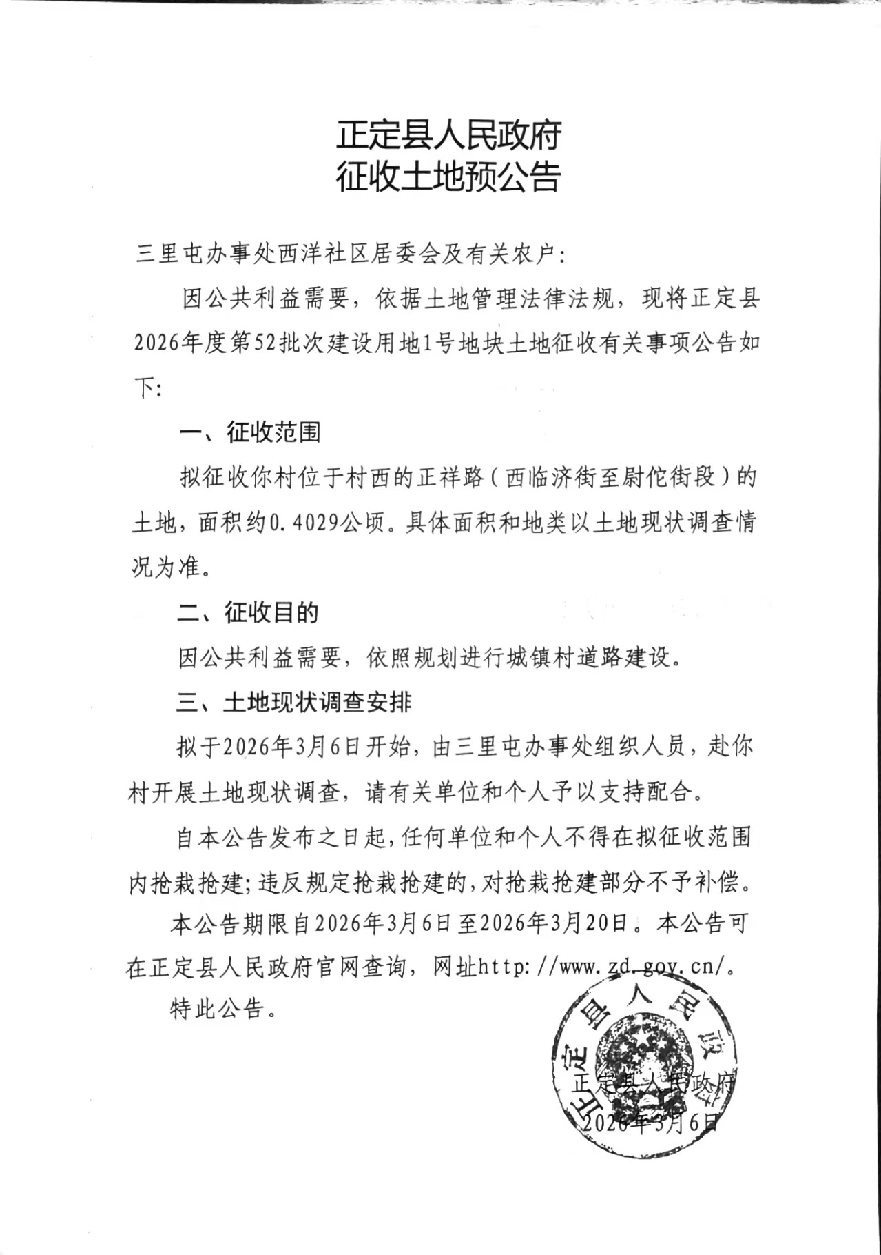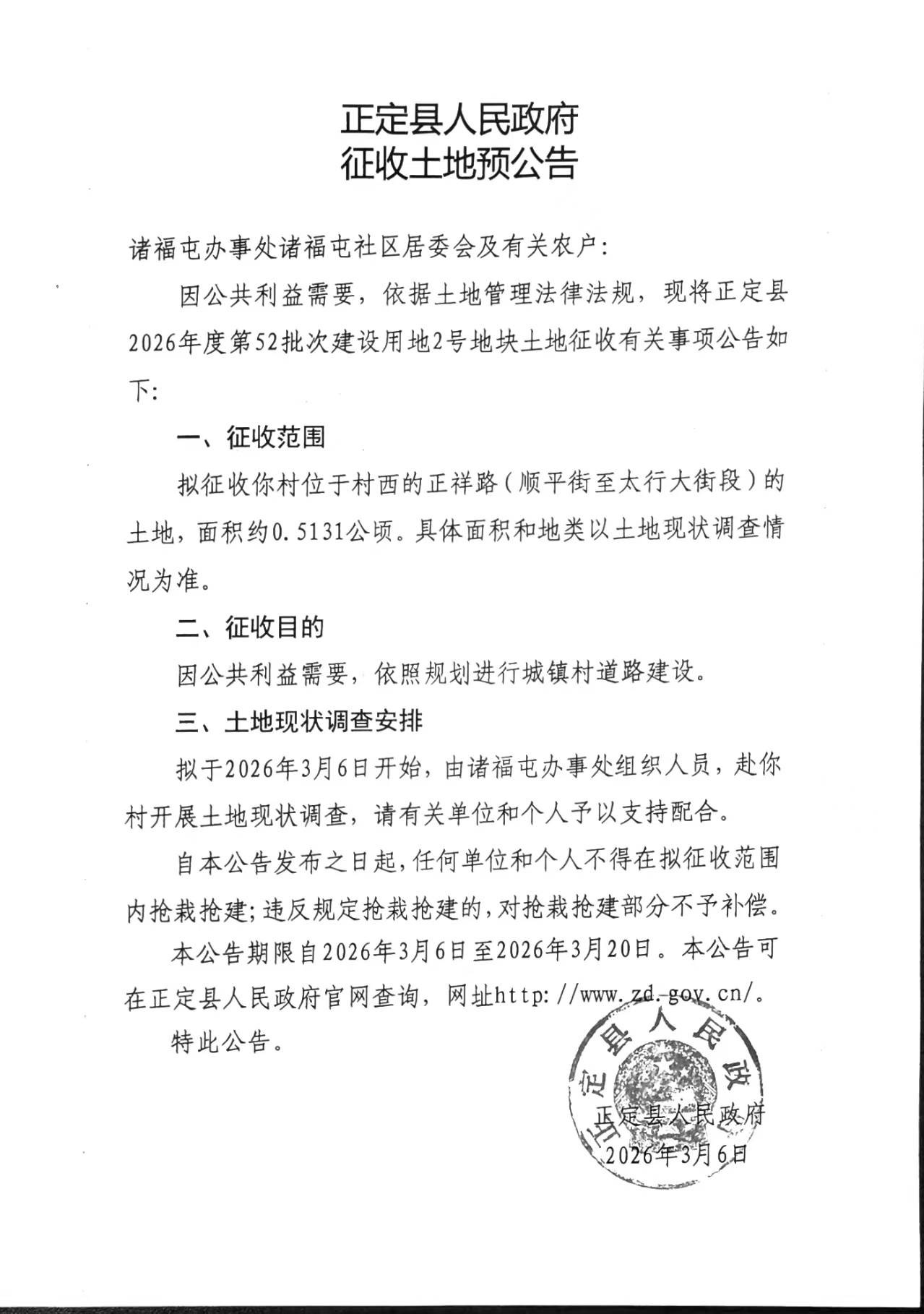 正定县人民政府关于正定县2026年度第52批次建设用地征收土地预公告
