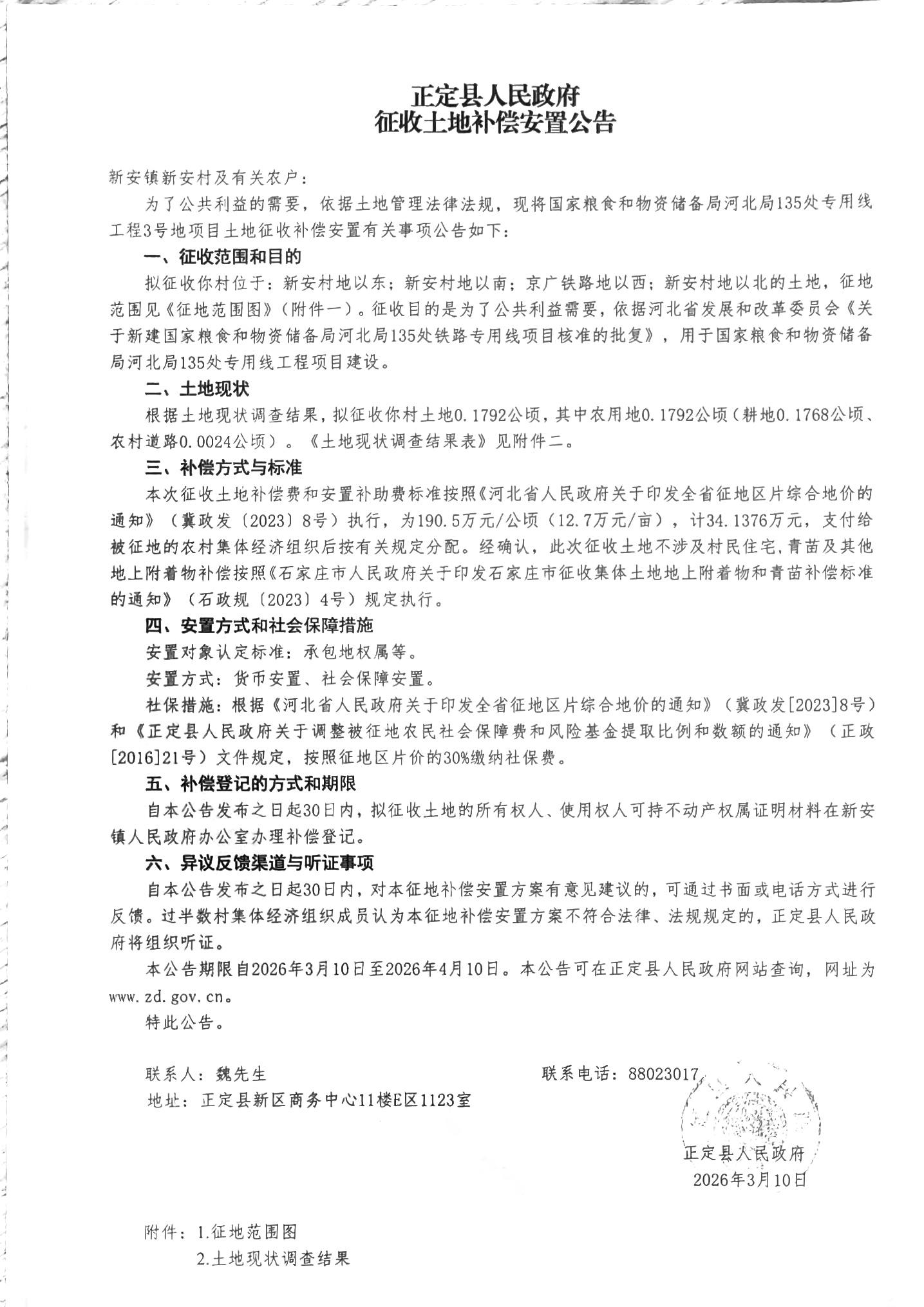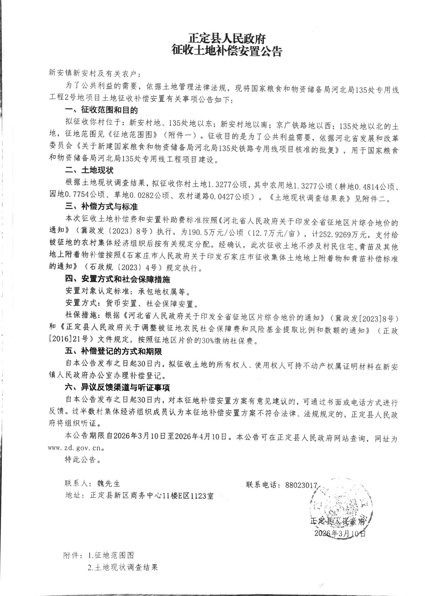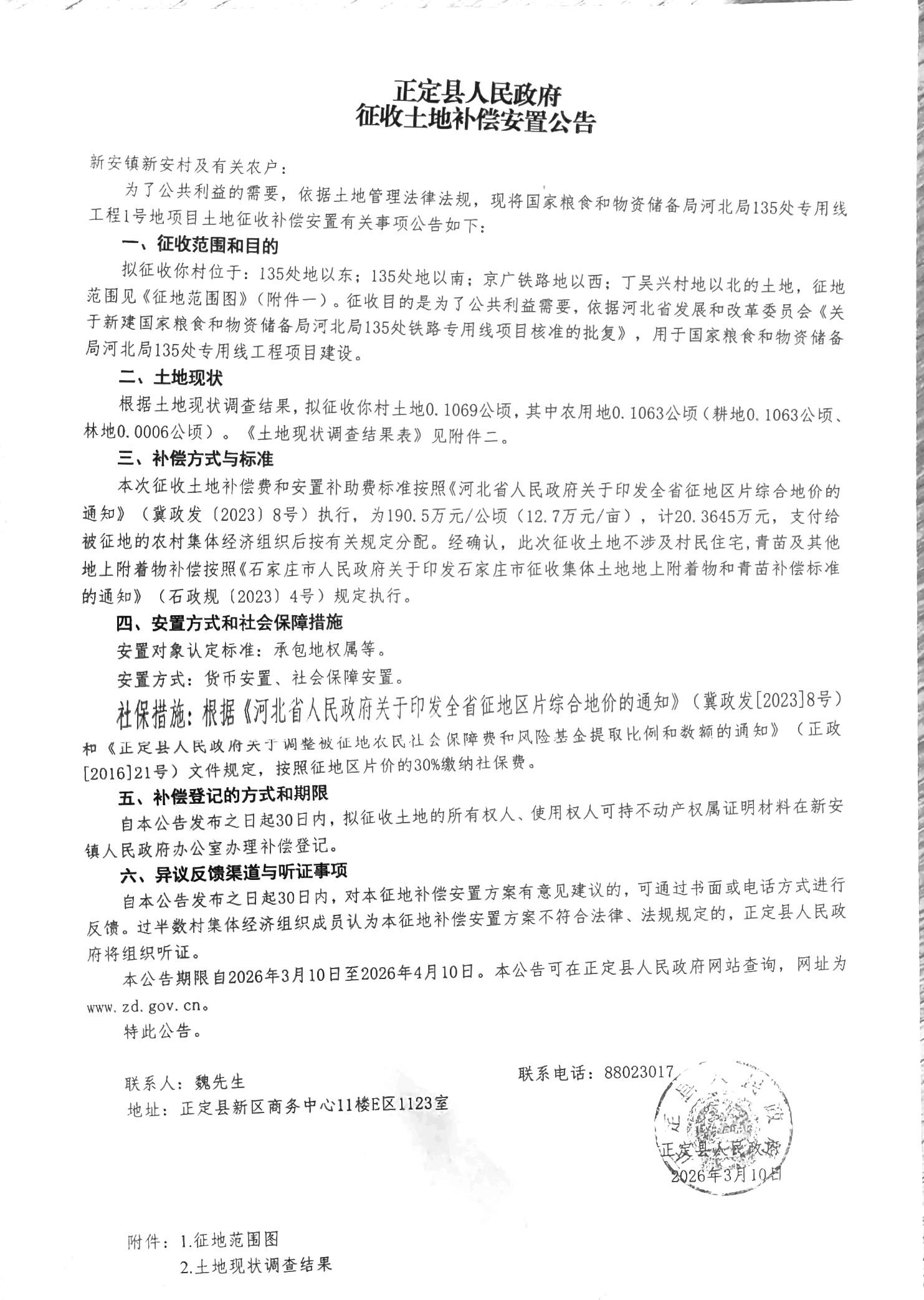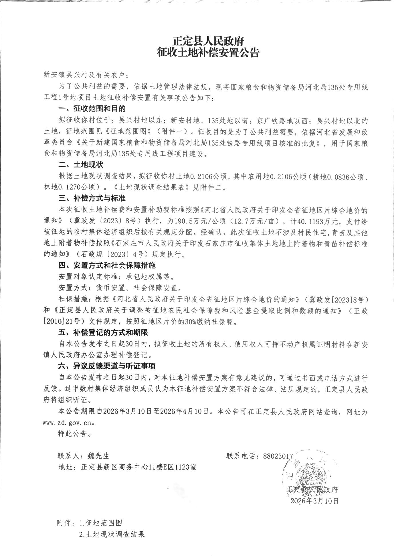 正定县人民政府关于国家粮食和物资储备局河北局135处专用线工程项目征收土地补偿安置方案公告