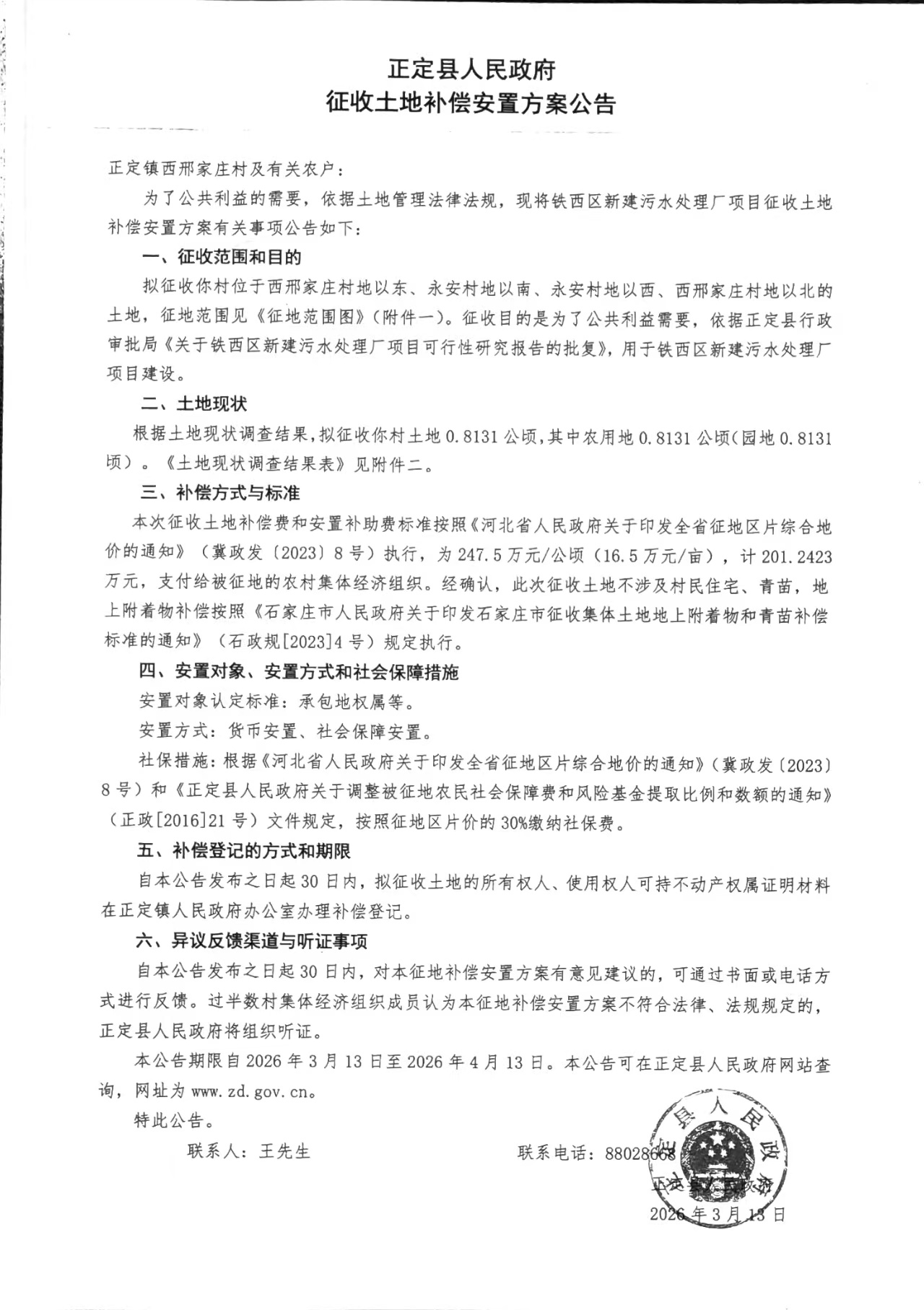 正定县人民政府关于铁西区新建污水处理厂项目征收土地补偿安置方案公告