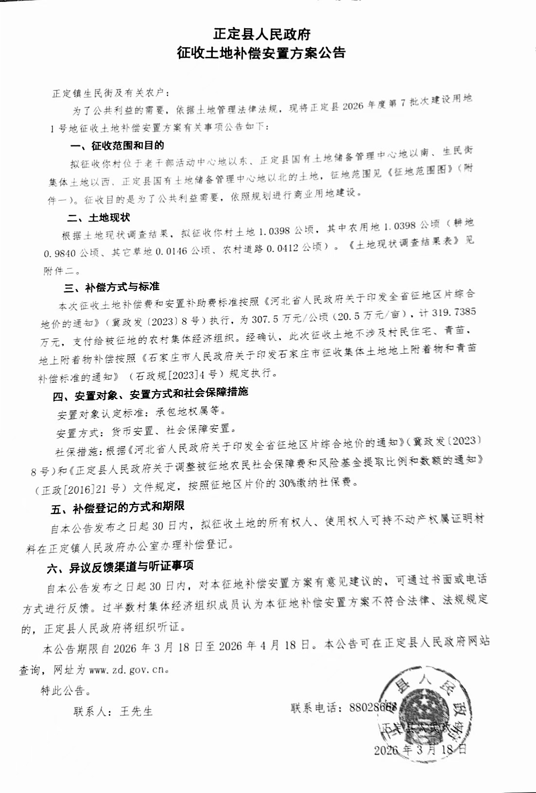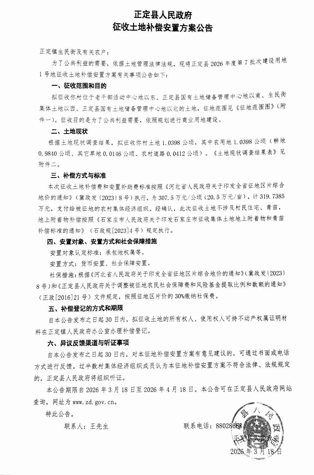 正定县人民政府关于正定县2026年度第7批次1号地建设用地征收土地补偿安置方案公告