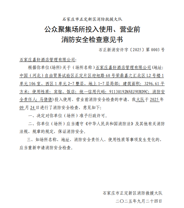 石家庄市正定新区消防救援大队对石家庄嘉轩酒店管理有限公司行政许可的公示