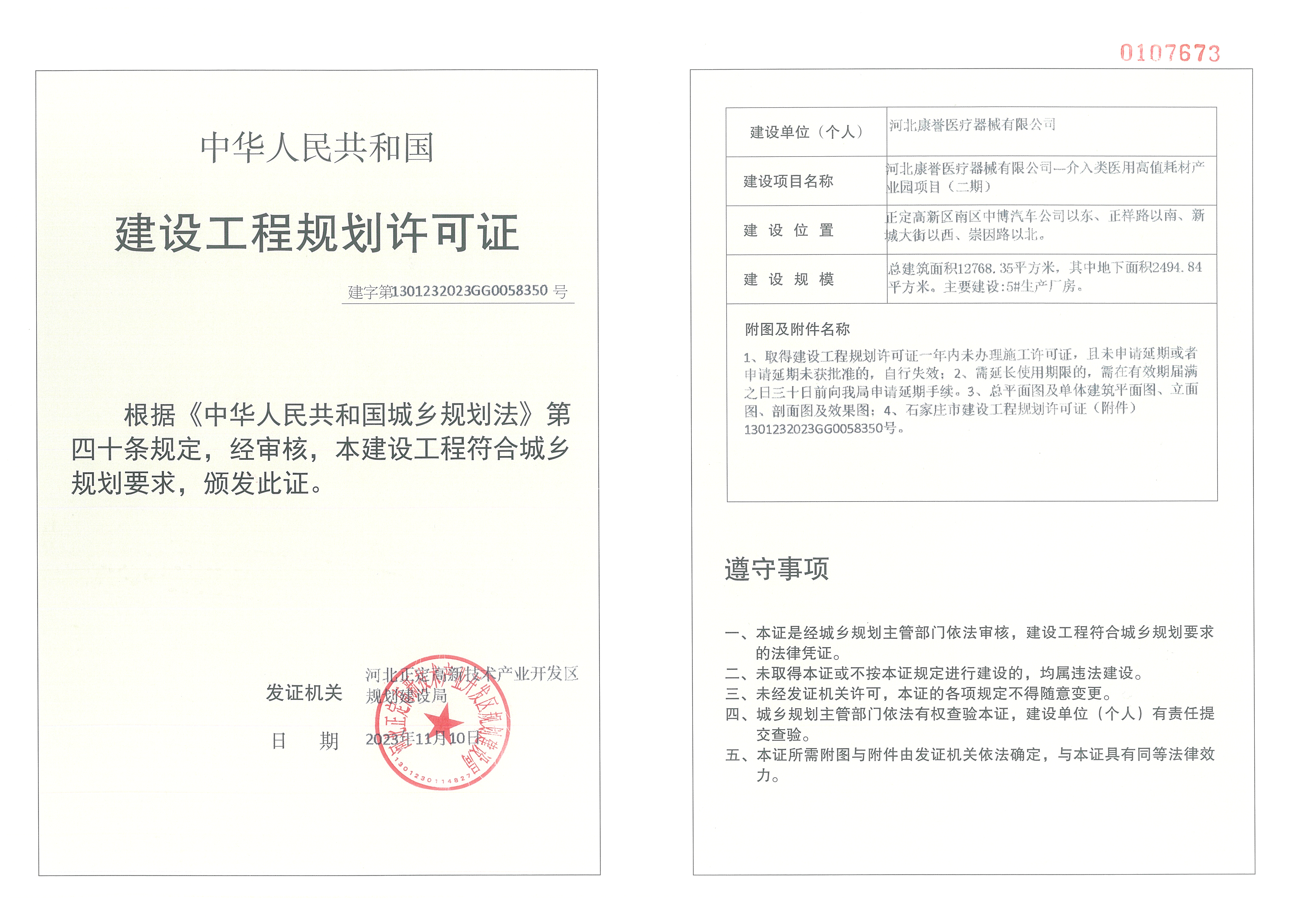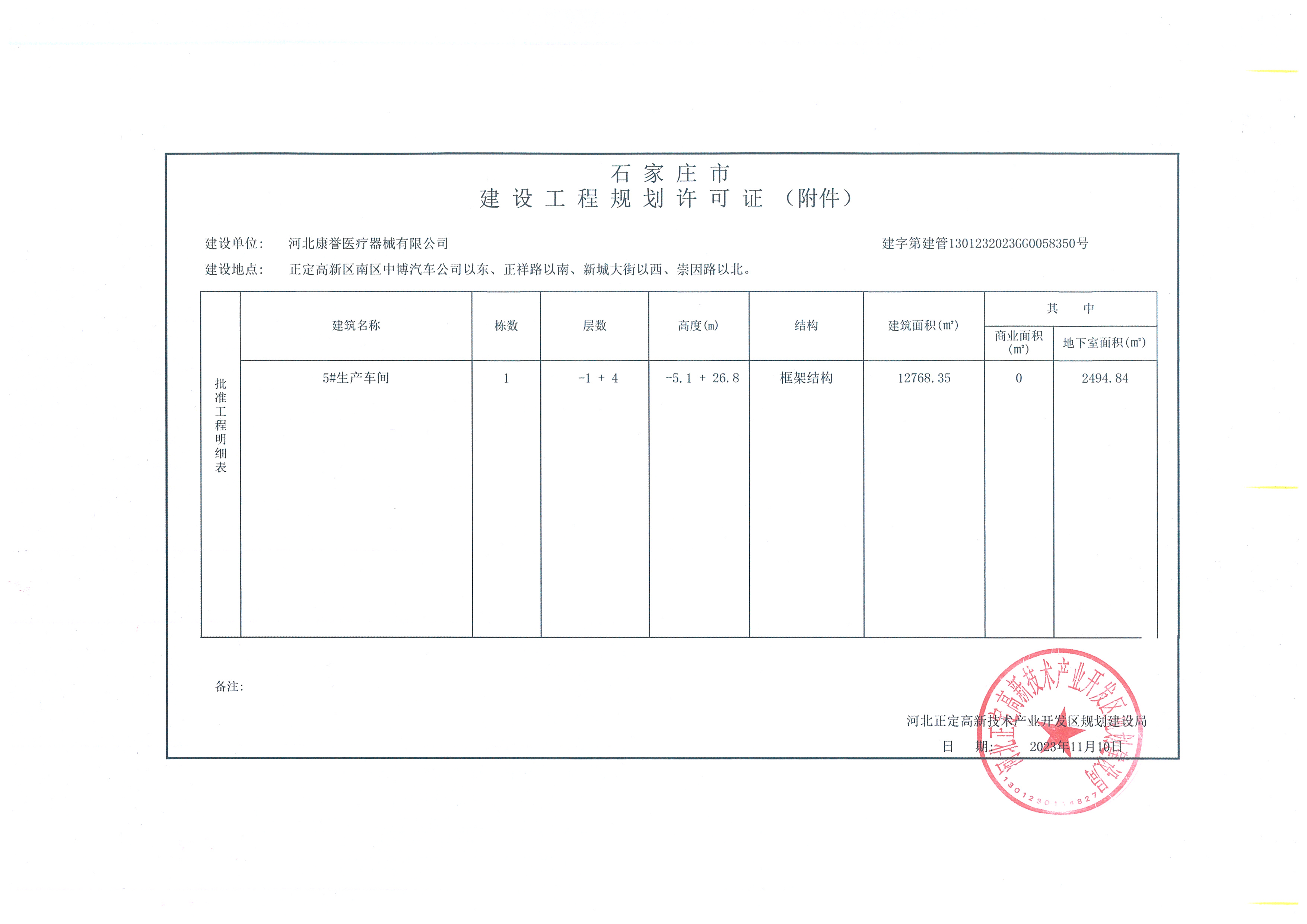 我局于2023年11月10日核发河北康誉医疗器械有限公司--介入类医用高值耗材产业园项目(二期)建设工程规划许可证,证号:建字第1301232023GG0058350号。项目单位:河北康誉医疗器械有限公司,项目位置:正定高新区南区中博汽车公司以东、正祥路以南、新城大街以西、崇因路以北。建设规模:总建筑面积12768.35平方米,其中地下面积2494.84平方米。主要建设:5#生产厂房。