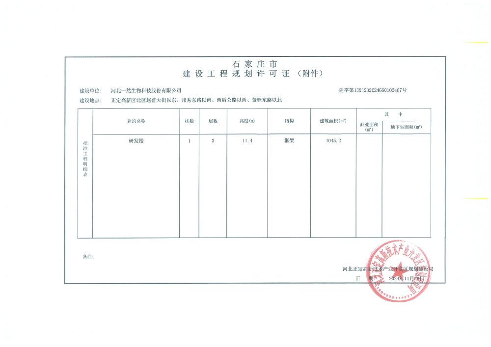 我局于2024年11月29日核发一然生物微生物活菌制剂三期项目(研发楼)建设工程规划许可证,证号:建字第1301232024GG0102467号。项目单位:河北一然生物科技股份有限公司,项目位置:正定高新区北区赵普大街以东、邦秀东路以南、西后公路以西、董铨东路以北。建设规模:总建筑面积1045.2平方米。主要建设:研发楼。
