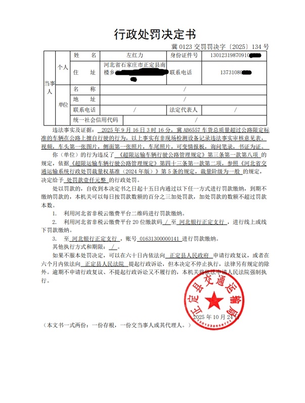 左红力的车辆冀AB6557车货总质量超过公路限定标准的车辆在公路上擅自行驶行为案