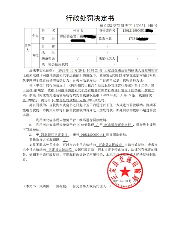 杜雪飞驾驶冀AF08843车辆未取得《网络预约出租汽车运输证》从事网约车经营活动的案