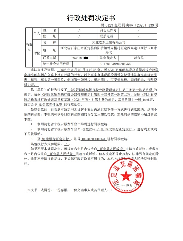 河北皓东运输有限公司的车辆冀A231CF车货总质量超过公路限定标准的车辆在公路上擅自行驶行为案