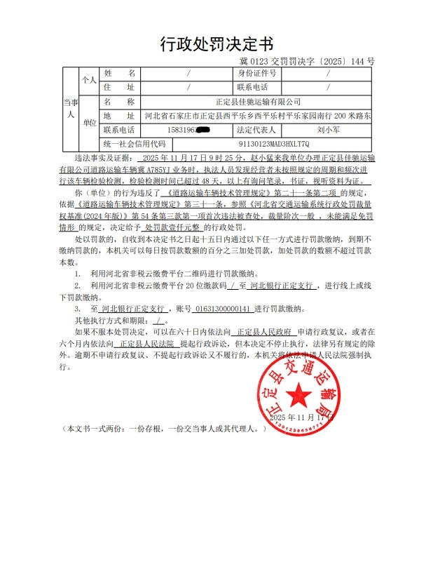 正定县佳驰运输有限公司未按照规定的周期和频次进行车辆检验检测的案
