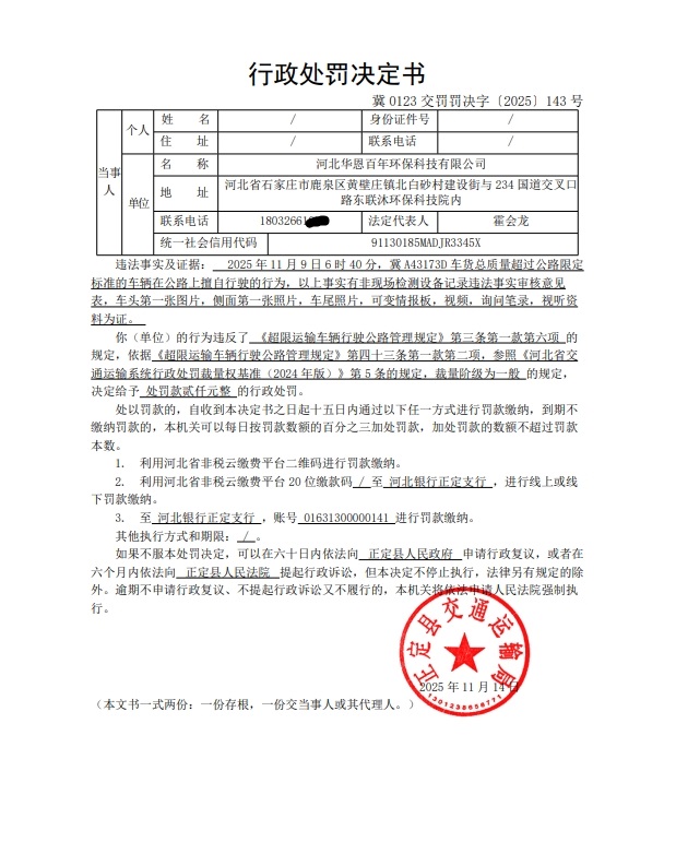 河北华恩百年环保科技有限公司(冀A43173D)车货总质量超过公路限定标准的车辆在公路上擅自行驶行为案