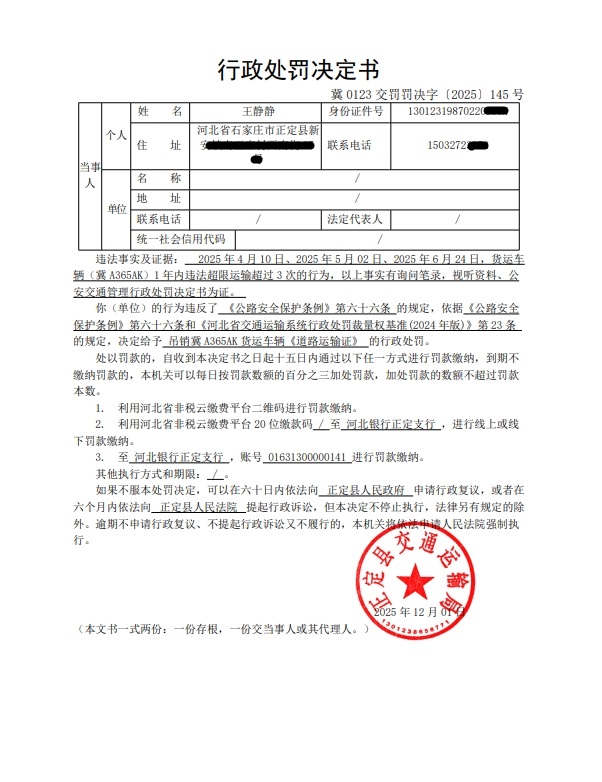 王静静(冀A365AK)货运车辆1年内违法超限运输3次的案