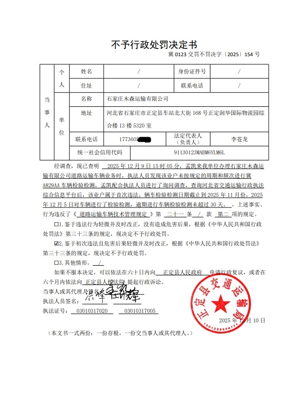 石家庄木森运输有限公司未按照规定的周期和频次进行车辆检验检测的案