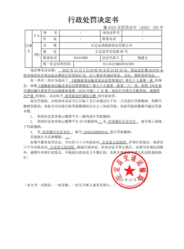 正定运鸿旅游客运有限公司客运包车未持有有效的包车客运标志牌进行经营的案
