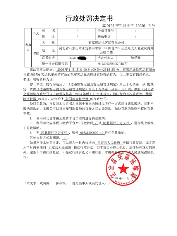 石家庄途悦客运有限公司客运包车未持有有效的包车客运标志牌进行经营的案