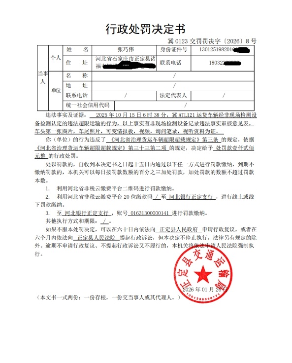 张巧伟的车辆冀ATL121经非现场检测设备检测认定的违法超限行为案