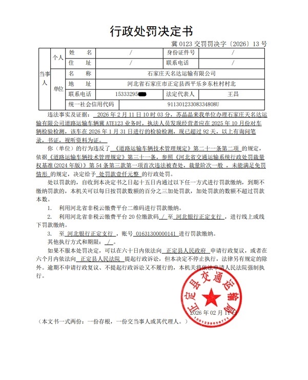 石家庄天名达运输有限公司冀ATE123未按照规定的周期和频次进行车辆检验检测的案