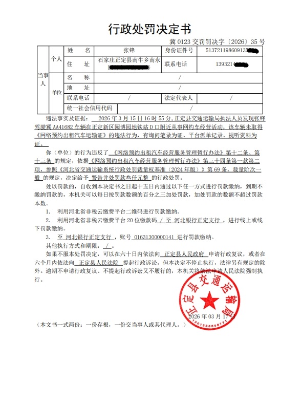 张锋驾驶冀AA41682车辆未取得《网络预约出租汽车运输证》从事网约车经营活动的案