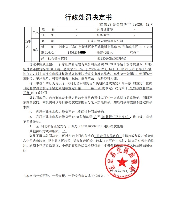 石家庄烨岩运输有限公司(冀A35730D)车货总质量59.8吨超过最高限值百分之92.9的案