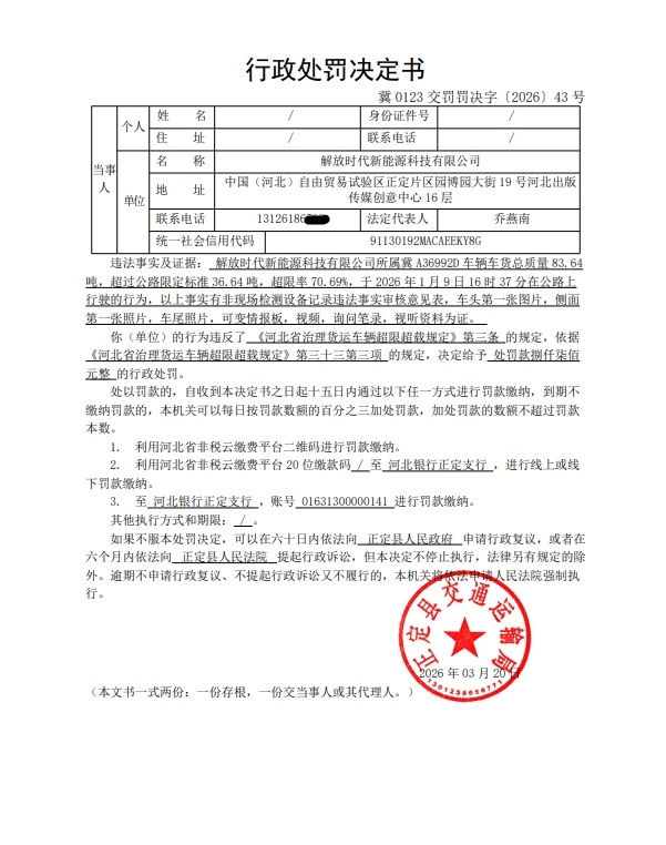 解放时代新能源科技有限公司(冀A36992D)车货总质量83.64吨超过最高限值百分之70.69的案