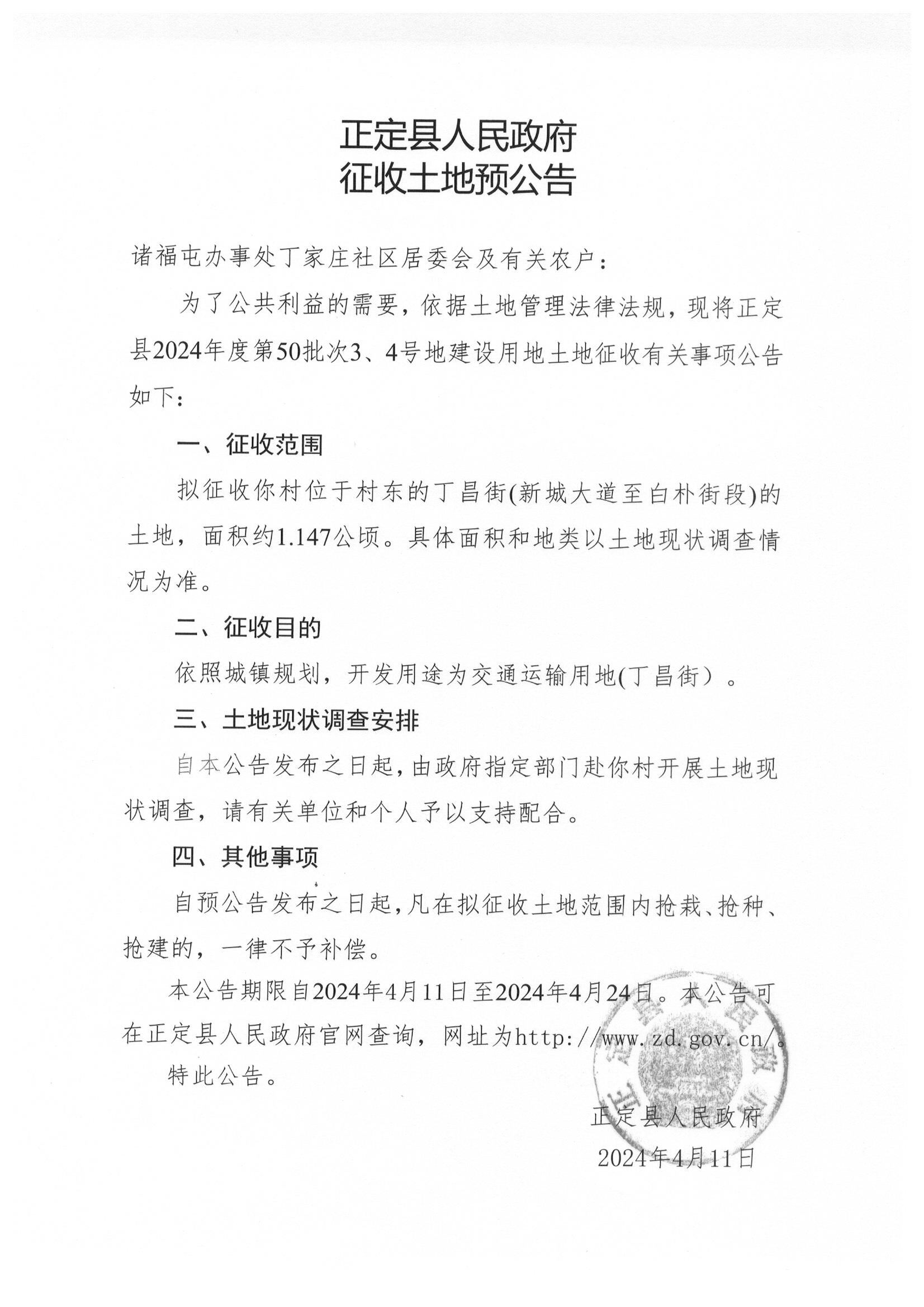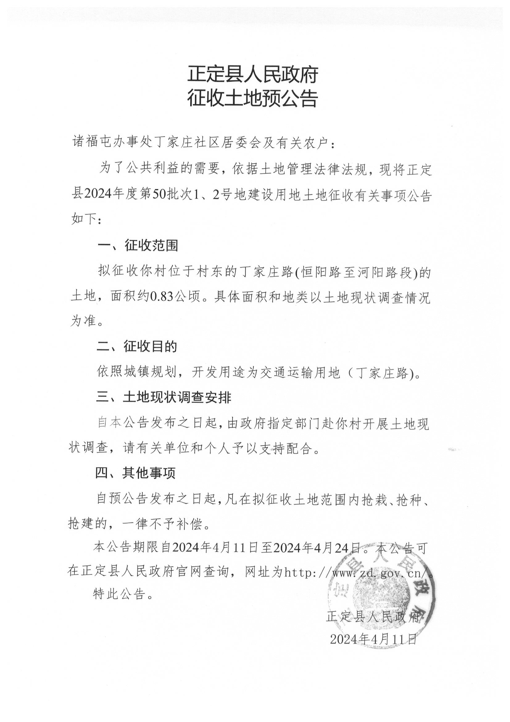 正定县人民政府关于正定县2024年度第50批次建设用地征收土地预公告